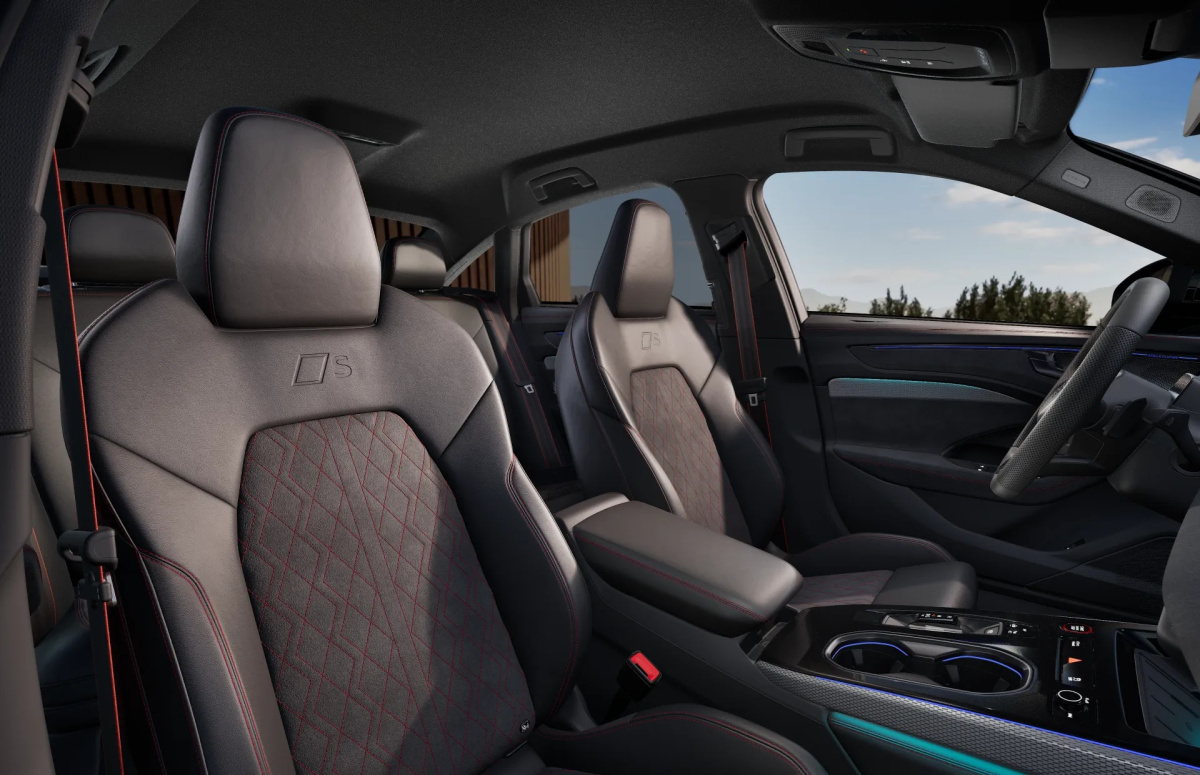 - Interiér balíka S so športovými sedadlami v kombinácii mikrovlákno Dinamica/koža v čiernej farbe, farebné prešívanie v červenej farbe Audi Sport